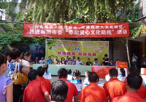 2012年全国助残日,民进南阳市委组织举办了“奉献爱心文化助残”活动,通过联系爱心企业的方式,向南阳市特教职业学校等单位捐助款物6万余元;5月末,市委会组织会员到南阳脑瘫儿童康复中心慰问,送去款物2万余元;6月末,市委会到南阳市新野县王庄镇张湾移民新村进行慰问,并向新村小学捐赠了部分书籍和体育用品。