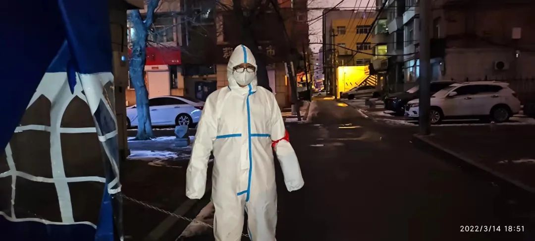周晓时和金鑫是民进长春市委会机关派出的第三批志愿者,3月14日到岗,他们被指派在自强街道参与卡点封控工作,工作时间最长达12个小时。从3月19日起,金鑫开始从凌晨2点起值守至早晨8点,这个时间段对于绝大数人来说都是在温暖的被窝里酣睡好梦,对于金鑫来说,他要顶着零下几度的低温,站在寒风中时刻保持着清醒。“还行吧,室外冻一冻,风吹一吹,反而有助于保持清醒”,提起半夜值守的困难,金鑫轻描淡写地说。金鑫克服恶劣天气给工作带来的影响,认真履行职责,在他值守期间,检查劝返小区居民50余人。他严格把关,未放一位无证居民出卡点。金鑫值守的小区为老旧小区,又地处市中心,存在大量租住户,人员情况复杂。他与居民接触时始终保持耐心,态度温和,从大局出发为居民宣讲相关政策法规并取得谅解。周晓时也承担着同样的工作,有时值班在半夜加上风寒交加,对于54岁的周晓时来说是个极大的考验,但是他积极克服困难,始终坚持在抗击疫情的第一线,每次从家步行一个小时参加值守。