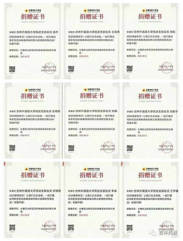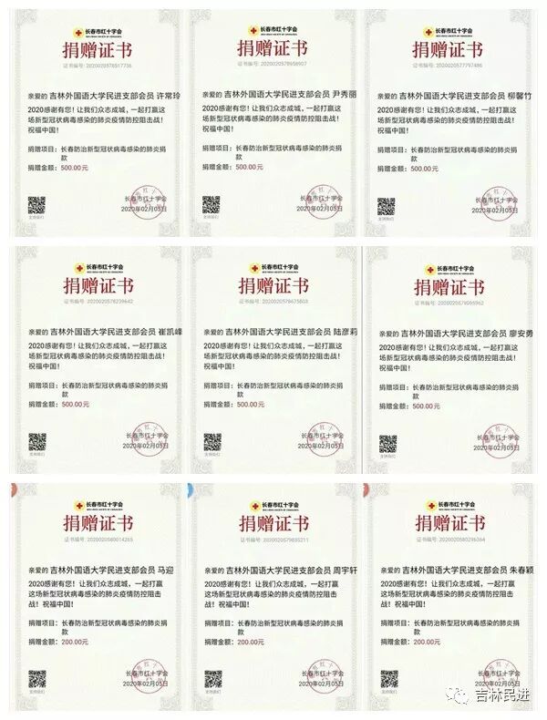 2月5日,民进吉林外国语大学支部发起捐献善款活动,为长春防治新型冠状病毒感染的肺炎疫情防控工作出一份力。支部全体会员、联系对象,彭明新、柳馨竹、刘振宇、崔凯峰、宛彪、刘婧、周宇轩、许常玲、马迎、陆彦莉、王海燕、吴尽、李卓、朱春颖、步晓燕、王学睿、尹秀丽、廖安勇等十八位老师参与捐款,共计向长春市红十字会捐款7200元。