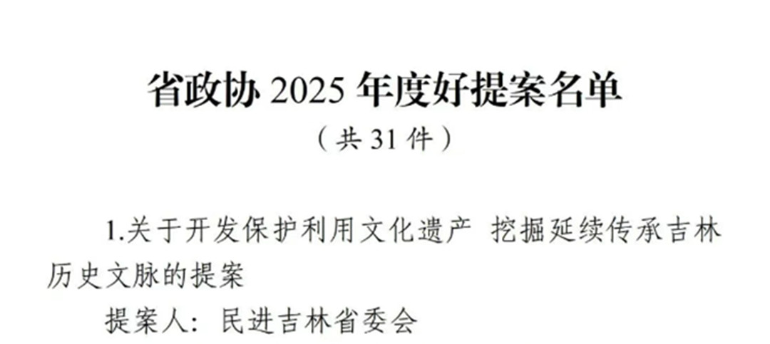 吉林省政协共评选出31件2025年度好提案,民进吉林省委会提交的《关于开发保护利用文化遗产 挖掘延续传承吉林历史文脉的提案》入选。该提案作为省政协2025年度重点提案,由中共吉林省委书记黄强领衔督办。