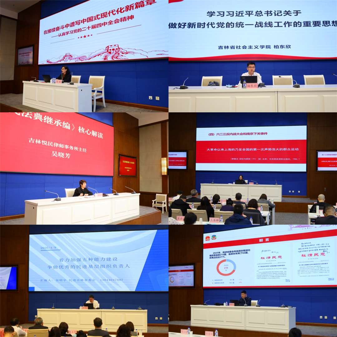 本次培训邀请吉林大学马克思主义学院副院长、教授石瑛,省社院教研室讲师柏东欣,吉林悦民律师事务所主任吴晓芳,民进中央会史宣讲团成员、省委会宣传部部长任红薇,民进吉林省委会秘书长兼组织部部长吴明宇,省政协研究室宣传信息处副处长李伟达,分别讲授《在接续奋斗中谱写中国式现代化新篇章——认真学习中共二十届四中全会精神》《习近平总书记关于做好新时代党的统一战线工作的重要思想》《中国民主促进会会史》《着力加强“五种能力”建设——争做一名优秀的民进基层组织负责人》《推进反映社情民意信息工作高质量发展》。培训班还邀请学员、吉林悦民律师事务所主任吴晓芳分享《民法典继承编核心解读》,并组织观看了北京大学哲学系长聘副教授张梧在中央社会主义学院的视频课程《铸牢中华民族共同体意识》。