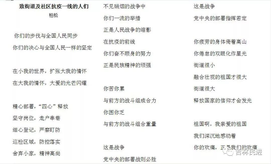 (十)柏松,民进会员、长春市南关区鸿城街道办事处文体科原科长,创作以“抗击疫情”为主题的《我的祖国》《总理来到武汉》《致敬战斗者》《赞钟南山》《致街道及社区抗疫一线的人们》等作品。