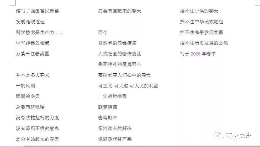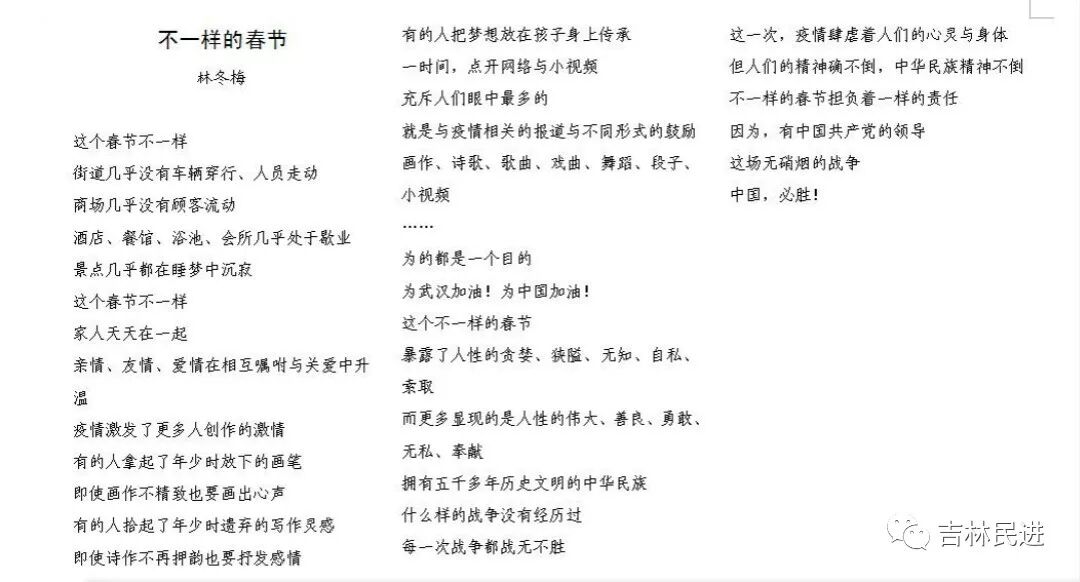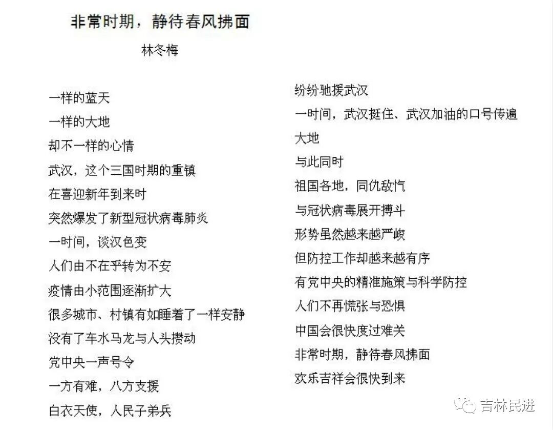 (八)林冬梅,民进会员,吉林省经济管理干部学院计划财务处处长、教授,创作以“抗击疫情”为主题的现代诗《不一样的春节》《非常时期,静待春风拂面》。
