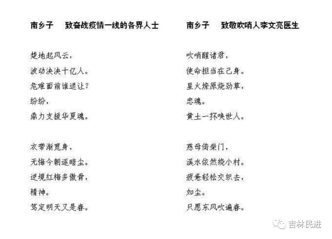 (九)郑瑞萍,民进松原市扶余支部副主委、扶余市政协文教文史委主任,创作以“抗击疫情”为主题的诗词《南乡子•致奋战疫情一线的各界人士》《南乡子•致敬吹哨人李文亮医生》。