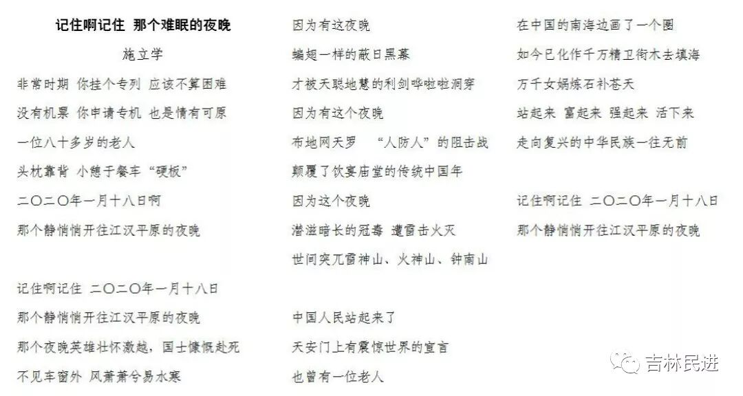 (二)施立学,民进吉林省直工委原主委、吉林省民俗学会原理事长、吉林省政府文史馆员,创作以“抗击疫情”为主题的现代诗《记住啊记住,那个难眠的夜晚》。