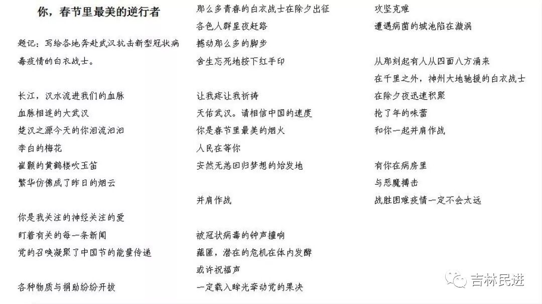 (五)张雁秋,民进会员、辽源市水务集团职工,创作以“抗击疫情”为主题的诗歌《你,春节里最美的逆行者》。