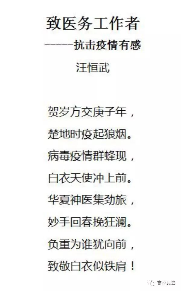 (七)汪恒武,民进辽源市经济支部副主委、辽源市市场监管局西安分局新北执法队副队长,创作以“抗击疫情”为主题的诗歌《致医务工作者》。