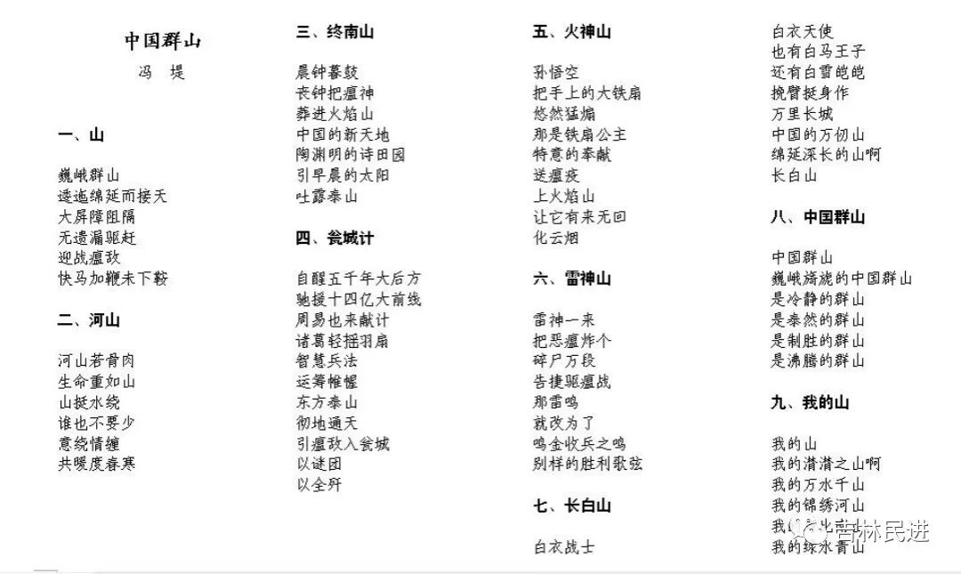 (三)冯堤,民进会员、吉林省政协委员、吉林省文艺评论家协会理事、长春市作家协会副主席、吉林风度力品牌形象策划顾问有限公司董事长,创作以“抗击疫情”为主题的现代诗《中国群山》。