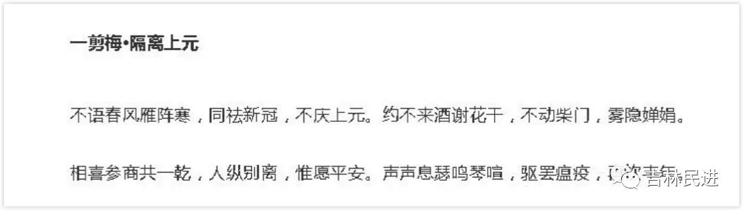 (四)初雪飞,民进松原市委会副主委、扶余支部主委、扶余市政协副主席,创作以“抗击疫情”为主题的诗词《一剪梅•隔离上元》。