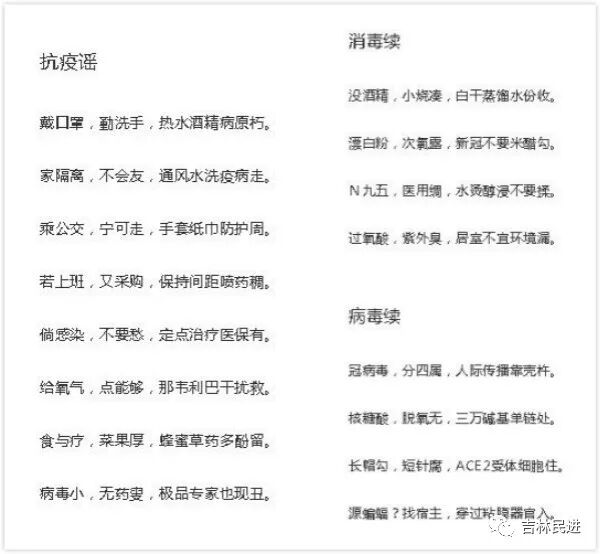 (六)李大军,民进会员、吉林农业大学教师,创作以“抗击疫情”为主题的《抗疫谣》《消毒续》《病毒续》。