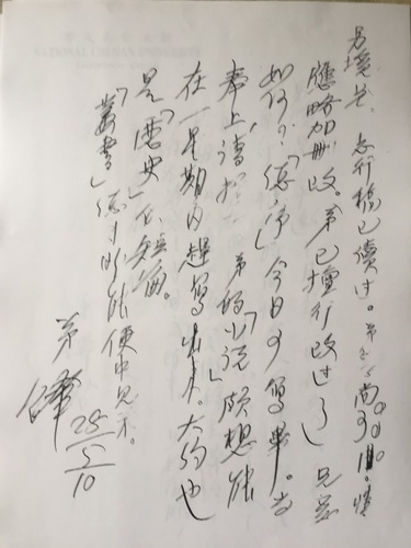 承邀十日下午二时到贵校,本应遵命。唯该时间恰为文艺座谈会之时间,实在无法分身。乞原谅!从下星期日起,该座谈会拟移至华华,乞俯允,为感!时间:下午二时半。兄如有暇,并乞参加。匆候