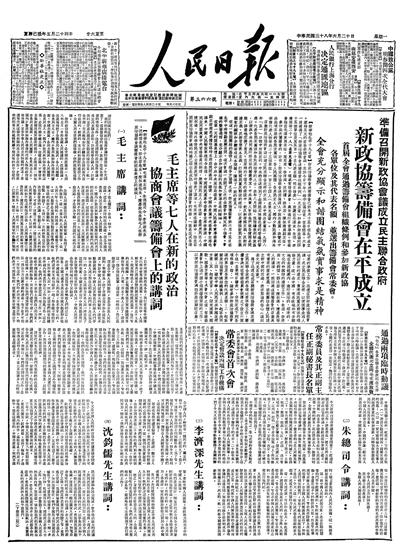 《人民日报》以大量篇幅详细报道了会议的各项议程、重要讲话和决议。现已泛黄的报纸,成为珍贵的档案之一。其头版头条是:《准备召开新政协会议 成立民主联合政府,新政协筹备会在平成立。首届全会通过筹备会组织条例和参加新政协的各参加单位及其代表名额,并选出筹备会常委会》。在头版刊登毛主席、朱总司令、李济深、沈钧儒、郭沫若、陈叔通、陈嘉庚7人在新政治协商会议筹备会上的讲话,还刊登了《通过两项临时动议》《常务委员会及其正副主任正副秘书长名单》《常委会首次会》。