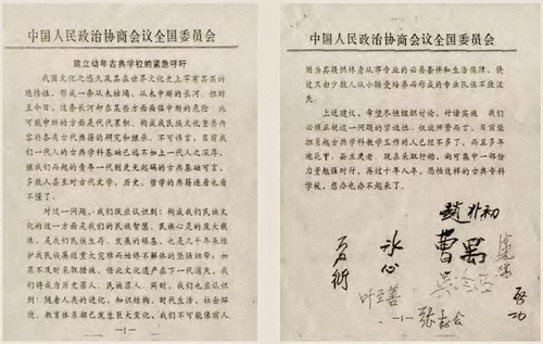 1995年3月3日,中国人民政治协商会议第八届全国委员会第三次会议在北京召开,以全国政协副主席赵朴初为首,另有冰心、曹禺、夏衍、叶至善、启功、吴冷西、陈荒煤、张志公,共9位德高望重的全国政协委员,联名提出名为《建立幼年古典学校的紧急呼吁》的提案,被大会列为第016号提案。