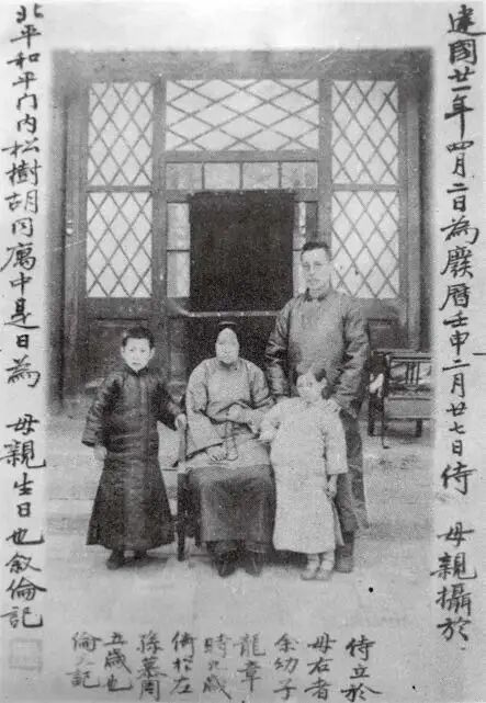 1932年4月2日,马叙伦(后右一)携幼子马龙章(左一)、长孙马慕周(右前一)侍母亲邹赘梅(前排中)于生日之际。