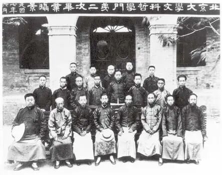 1918年,蔡元培等与文科哲学门第二次毕业生合影。前排左起:康宝忠、崔适、陈映璜、马叙伦、蔡元培、陈独秀、梁漱溟、陈汉章;中排左四为冯友兰,左七为胡鸣盛;后排左二为黄文弼,左五为孙本文。