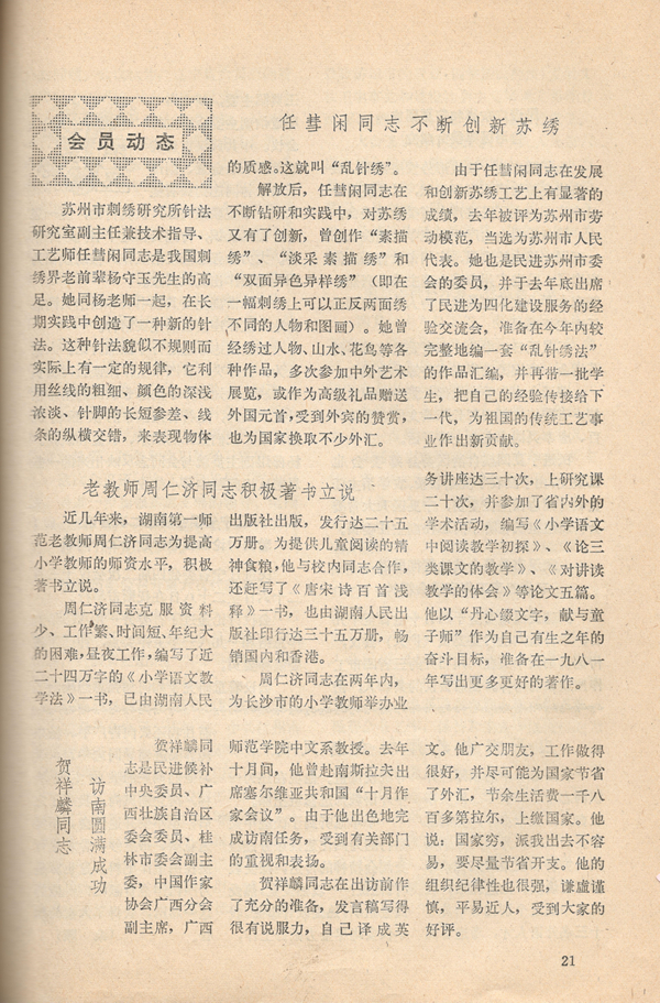由于任彗闲同志在发展和创新苏绣工艺上有显著的成绩,去年被评为苏州市劳动模范,当选为苏州市人民代表。她也是民进苏州市委会的委员,并于去年底出席了民进为四化建设服务的经验交流会,准备在今年内较完整地编一套“乱针绣法”的作品汇编,并再偕一批学生,把自己的经验传接给下一代,为祖国的传统工艺事业作出新贡献。