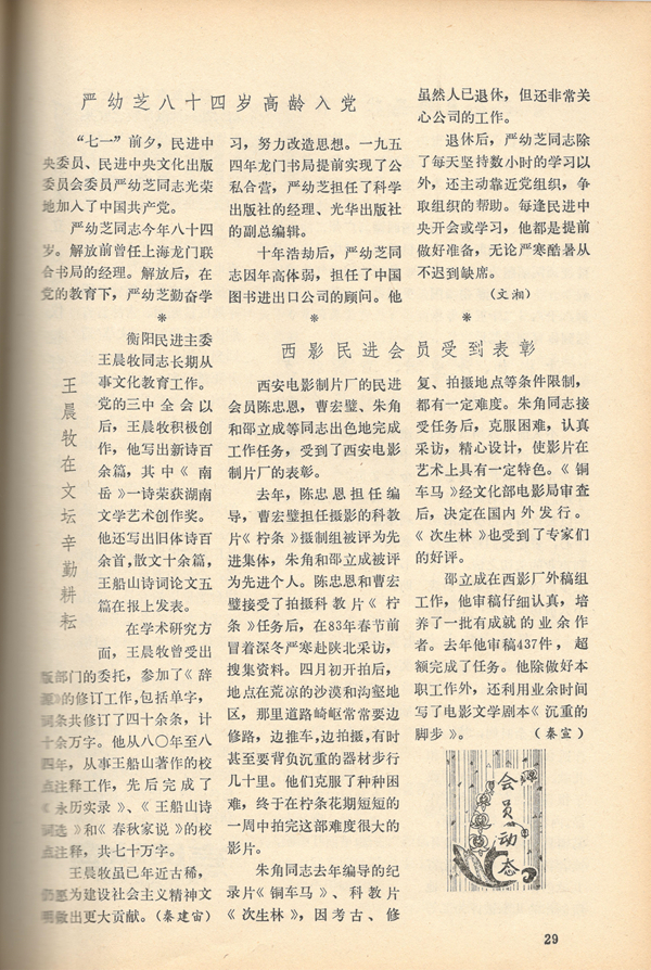 “七一”前夕,民进中央委员、民进中央文化出版委员会委员严幼芝同志光荣地加入了中国共产党。严幼芝同志今年八十四岁。解放前曾任上海龙门联合书局的经理。解放后,在党的教育下,严幼芝勤奋学习,努力改造思想。一九五四年龙门书局提前实现了公私合营,严幼芝担任了科学出版社的经理、光华出版社的副总编辑。