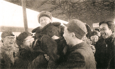 沈钧儒乘火车抵达北平东站,下车后,欢迎的群众把他抬了起来。