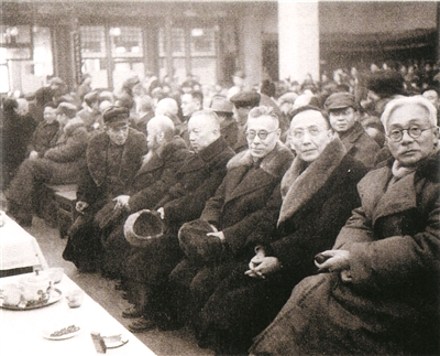 1949年2月26日,林伯渠、郭沫若、马叙伦、李济深、沈钧儒(右一至右五)等在欢迎各方民主人士大会上。