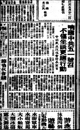 1948年5月24日,《华商报》刊载了民进在香港单独发表《宣言》响应中共“五一口号”的新闻。《宣言》指出:“五一”廿三条是近百年来中国革命史的结晶,是今后中国政治运动舵向的指标,中国的民主人士及民主党派就是要团结在这口号的周围,形成坚固的爱国民主统一战线,为反帝国主义,反封建主义,反官僚资本主义而奋斗,以奠定我们子子孙孙万世太平的始基。