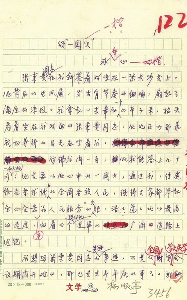 1978年7月13日,《颂“一团火”》完成。7月17日,周明在稿笺上概括了这篇作品的一些特点,“文章顺着报纸‘一团火’的路子,主要追究‘火’从何而来,多半篇幅写了旧社会张师傅的苦难生活”,并且“大量引用了群众给张师傅的来信”。总体而言,该作品的特点是亲切生动,感情充沛,引用大量青年来信使文本产生了鲜明的“对话感”,也极具生命力,有着较为独特的情感质地。原稿为7000字,由周明作了一些删改后,压缩为6500字。这些留存于手稿与稿笺之上的思考与文字修改痕迹,展现的是作品从底稿到刊发的生产过程,也是报告文学在新时期火热的生产现场的忠实记录,以及对时代脉搏的深情应和。手稿的价值恰恰在于它所保留的、被定稿所掩盖的“多声道”叙事。手稿定格了上世纪七十年代末的时代话语和语言风貌,“全国财贸学大庆学大寨会议”之类的政治短语、“同志”“师傅”的选用,是政治话语与文学表达关系的见证。被删改的部分作为一个未尽的“潜在文本”,存在于手稿之上,为读者和研究者提供了想象文本的空间。