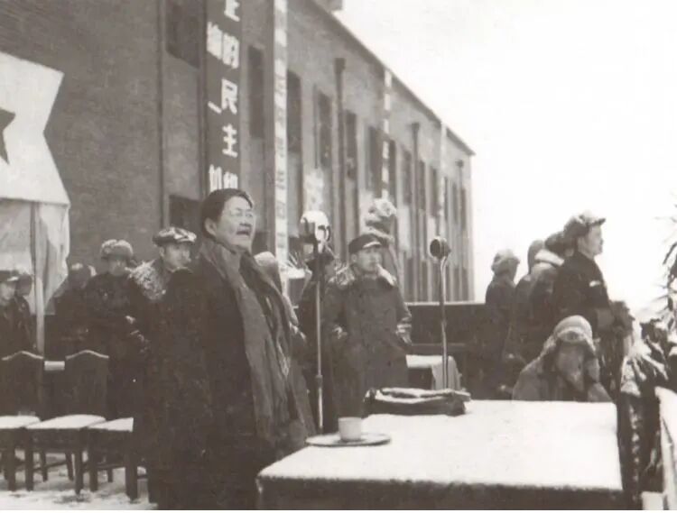 李德全在沈阳庆祝平津解放大会上发表讲话。