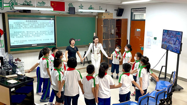 为响应国家教育改革的政策方针,这堂双师音乐课放到了下午放学后的课后服务时间。学校邀请了刘桐和胡斌斌一起来为孩子们授课。虽然有着丰富的演出经历,但面对这么多孩子,刘桐坦言依然会觉得紧张,担心孩子们会不会喜欢她讲的内容,还要想好怎么配合胡斌斌老师来讲课。作为海淀区艺术学科的骨干教师,胡斌斌有着丰富的教学经验,这堂课也让她对双师课堂有了新的认识。