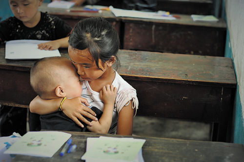 10月21日,一张《弟弟要睡了》的照片在腾讯微博一小时内被上千网友转发,许多人称感动得想哭。照片摄于今年7月29日,记录的是在凤凰县山江镇好友村小学课堂上,因为小弟弟闹困,正在听课的姐姐急忙抱起他,其实她自己也很困了。拍摄者卢七星称,女童的父母外出打工了,爷爷奶奶要干农活,所以女童带着弟弟上课,因为营养跟不上,小男孩的头看起来比较大。(10月23日《现代快报》)