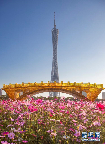 金光熠熠的《丝路金桥》与广州塔、海心沙公园和谐统一,它们一同在广州构筑出美丽的新景观,向世界展现经济发展、文化繁荣、社会稳定、人民团结、山河秀美的中国。
