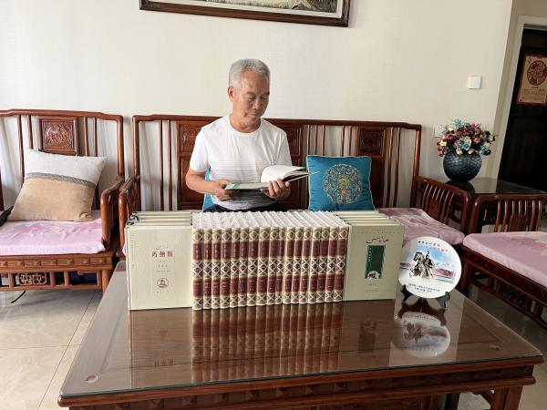 2022年6月,李瑞周在翻看新发行的《玛纳斯》全套十八卷中文版。