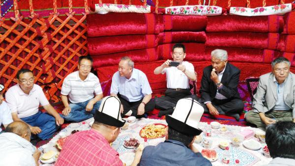 2015年7月,李瑞周和文友一起在柯尔克孜族牧民的毡房里做客采风。(正面左二为李瑞周)