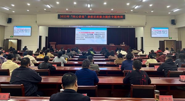 10月22日下午,民进随州市委会组织会员参加由中共随州市委统战部举办的2025年“同心讲堂”参政议政能力提升专题培训。培训由市委常委、组织部部长、统战部部长詹金灿主持,全国政协委员、湖北第二师范学院院长、民革湖北省委会副主委郑军作专题授课。