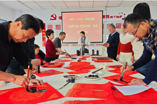 1月16日下午,民进天津市宝坻区支部携手宝平街成人文化技术学校走进宝平街道北岸社区,开展丙午(2026)民进全国“春联万家·策马启新”活动。支部会员与社区居民欢聚一堂,以笔墨传情、以剪纸寄意,共迎丙午马年新春。