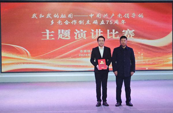12月17日上午,铜陵市统一战线“我和我的祖国——中国共产党领导的多党合作制度确立75周年”主题演讲比赛决赛在市广播电视台举行。铜陵民进3位会员在此次比赛中凭借出色的表现,分别获得一、二、三等奖的殊荣,充分展示了民进会员的风采。中共铜陵市委常委、统战部部长胡启书出席决赛现场并为获得一等奖的民进会员韩智勇颁奖。