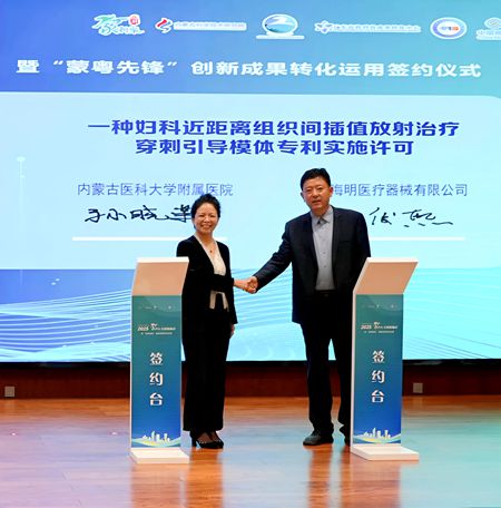 10月16日,由自治区科技厅、自治区科学技术协会指导,内蒙古科学技术研究院、内蒙古自治区人民政府驻深圳办事处、广东高校科技成果转化中心等5家单位联合主办的2025年度第66期“蒙科聚”专题发布会暨“蒙粤先锋”创新成果转化运用签约仪式在呼和浩特举行。会上,民进内蒙古医科大学支部副主委、内蒙古医科大学附属医院放射治疗科孙晓革教授团队研发的“妇科近距离组织间插植放射治疗穿刺引导模体”成功进行创新成果转化运用签约。