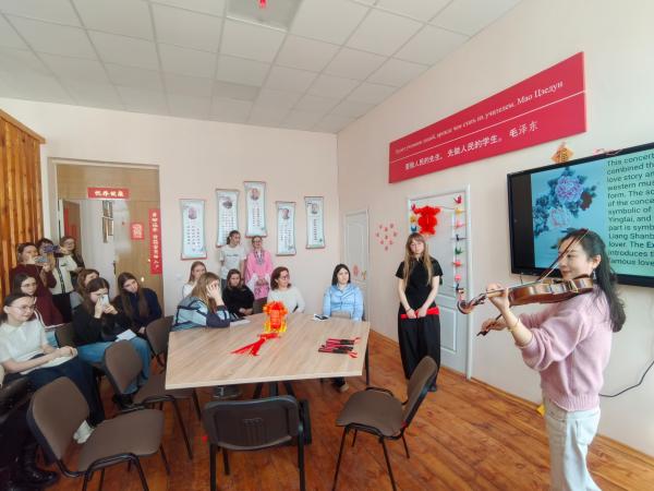 在乌里扬诺夫斯克国立师范大学校园开放日,阳静以《中国音乐文化之美》为题,围绕经典小提琴协奏曲《梁山伯与祝英台》展开专题讲座。她将现场演奏与文化解读相结合,深入阐释乐曲的旋律特色、情感表达与文化底蕴,让俄罗斯师生在优美弦音中领略中国音乐的艺术之美与东方美学意境。