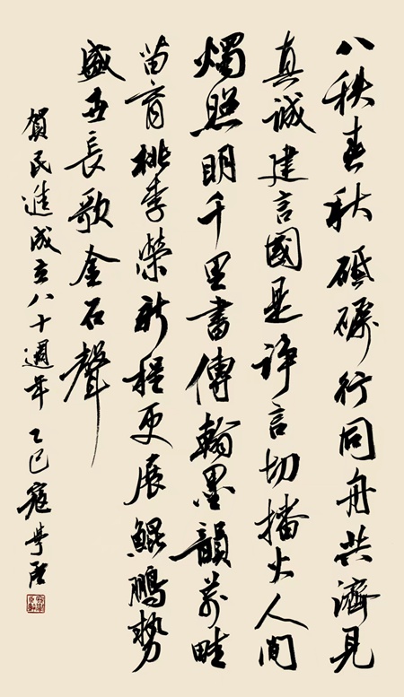 八秩春秋砥砺行, 同舟共济见真诚。 建言国是诤言切, 播火人间烛照明。 千里书传翰墨韵, 万畦苗育李桃荣。 新程更展鲲鹏势, 盛世长歌金石声。