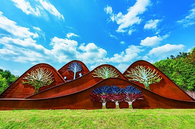 如何运用现代艺术表现方式和国际化的语言锻造出新时代的生态文化标志性符号?《江山多娇》在造型中采用无焊接连接制造工艺,流线型的造型既有表情达意的功能,又起到分割空间、转换空间的作用。观众在不断细化、转化、变化的空间里激活感官,由被动感受转换为主动感悟,获得独特的个人体验,作品艺术表现的广度、深度、强度也实现了全面提升。