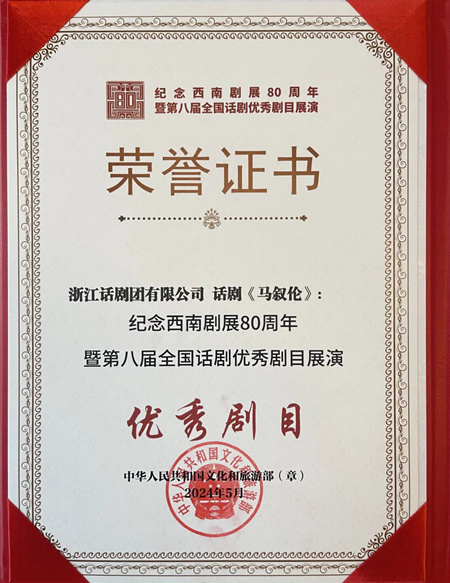 5月23日,由文化和旅游部、广西壮族自治区人民政府主办的纪念西南剧展80周年暨第八届全国话剧优秀剧目展演在广西南宁闭幕。闭幕式上,话剧《马叙伦》被授予纪念西南剧展80周年暨第八届全国话剧优秀剧目展演“优秀剧目”奖牌。