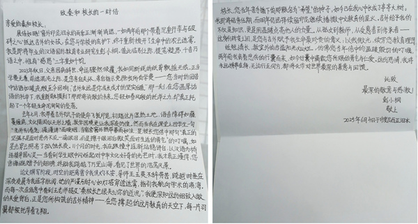 秦和校长在信中勉励彭小桐:可以通过努力发展成为传承中华文化走向世界的文化传播者,更可以成为培根铸魂、启智增慧的辛勤园丁,成为更优秀的自己,用自己的所学知识和专业特长,去服务人民、奉献国家,不负时代重托!
