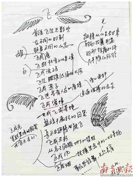 从赵丽宏《疼痛》手稿可以看出,诗人一边写诗,一边在旁边画画,写到关键字“飞”,就画几双羽翼,写到“脊梁”,就画一个挺直腰杆的男体。仿佛作者要先把心中的图像画出来,才能以此找到最精准的语言、最恰切的词汇。这大概就是苏轼形容王维“诗中有画,画中有诗”的境界吧。