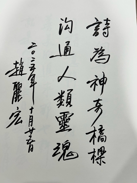 韩国著名诗人金具丝宣读了颁奖词,韩国文学家理事会理事长、KS国际诗歌奖评委会主席崔东镐为赵丽宏颁发了奖牌和奖金。颁奖典礼之后,赵丽宏为“韩国文学之家”题词:“诗为神奇桥梁,沟通人类灵魂”。