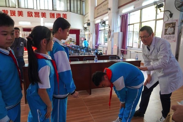 梁道臣正在给学生进行脊柱侧弯筛查。 记者 冯明旻 摄
