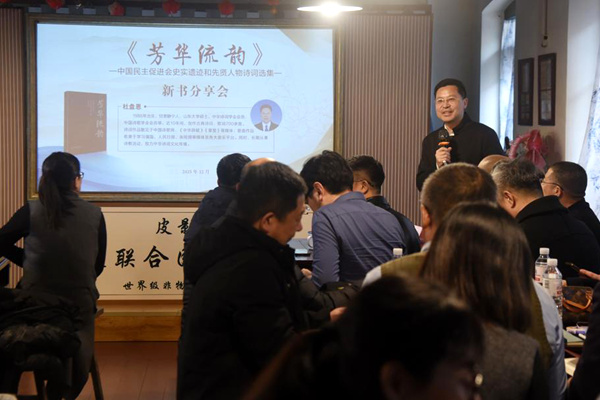 作者杜盘恩随后作《诗说民进会史》主题分享,深入解读了该诗集的创作背景与历史内涵,通过诗词艺术再现民进先贤的奋斗历程与精神风貌,为理解多党合作历史提供了生动素材。