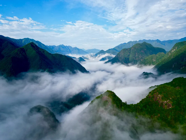 突兀的峰顶以70度的锐角直刺蓝天,薄薄的云雾向峭壁飘移,为青灰色山体披上一袭绉纱,整座山恰似一面东风鼓荡的高牙大纛。