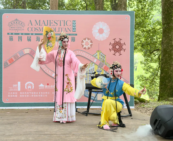 我们在草坪上欣赏了《画廊遗梦之海誓山盟》的定制版音乐剧和昆剧《牡丹亭》片段,在悬崖咖啡馆喝了手冲咖啡,还跟着罗总参观了土地庙和药王庙。药王庙旁边有间厨房,村民举办祈福活动时生火煮饭,熄火后就转身为乡野美术馆。此次正好撞见诗人朱增光的诗歌实验展,灶台、烟道、缝纫机、翘头案、长条凳都成了作品的呈现平台。青年诗人在黄泥墙上留下了诗行:“旗山的美,是身体远游后的精神归隐,是远在江湖之外的,诗意微醺。”