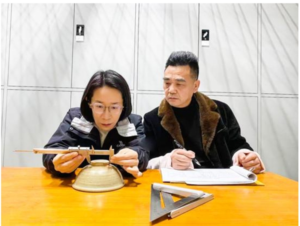 李晓杰测量文物(左)