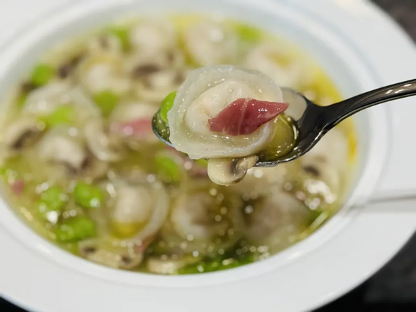 一枚含口,舌尖轻抵,鲜嫩润滑,不可名状;青椒泥里沉浮着几根细如发丝的笋丝,以清雅鲜碧的色泽和轻微的舌尖撩拨,含蓄地表达了中国烹饪艺术的审美理念。