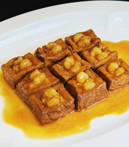 比如镜箱豆腐,豆腐切块沥去水分,入油锅炸至结壳,捞出沥油。冷却后在每块豆腐中间挖出一个方坑,酿入猪肉馅,在上面装配一对弯弯的虾仁。然后倒油入锅,煸香葱末,将镜箱豆腐生坯滑入锅内,加调味、高汤小火煮几分钟后转大火收汁,最后勾芡、淋熟猪油增香润色。在腰盆分列两行,真像一只只八宝玲珑小镜箱,而虾仁就成了惟妙惟肖的铜拎襻。
