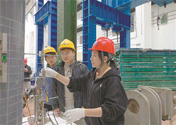 许莉(右一)带领团队开展桥墩拟静力试验。